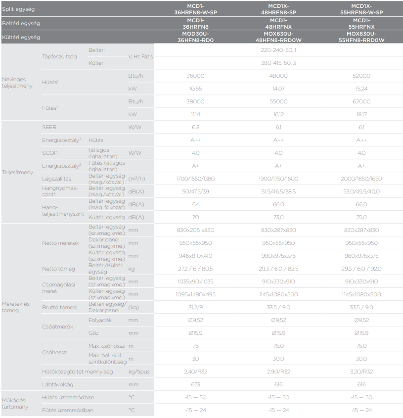 A Midea MCD1X-55HRFN8-W-SP kazettás split (R32, 16,1 kW, breezeless funkcióval) fontos tulajdonságai: